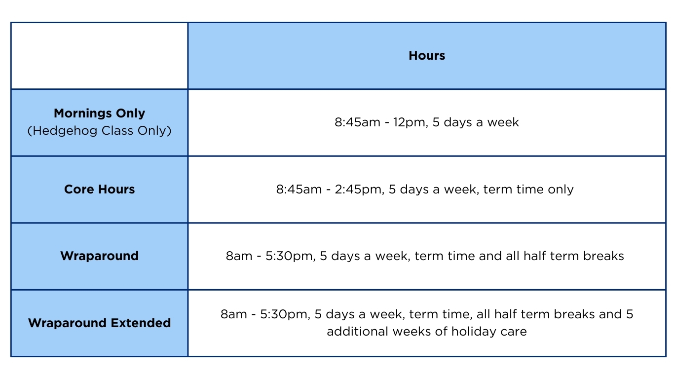 Children who are enrolled in the core hours option will be able to attend after school care and school holiday care, subject to availability. As we are now running our holiday and wraparound care in-house, spaces are limited due to staffing. Therefore, to ensure a guaranteed spot for the extended care, you need to opt into the appropriate package to suit your desired hours. However, if there are additional spaces available, we will offer these to other children in the Nursery.